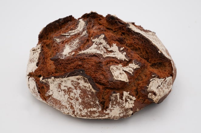 Rustikales Roggenmischbrot mit kräftiger Kruste und hauseigenem Natursauerteig auf Stein gebacken.